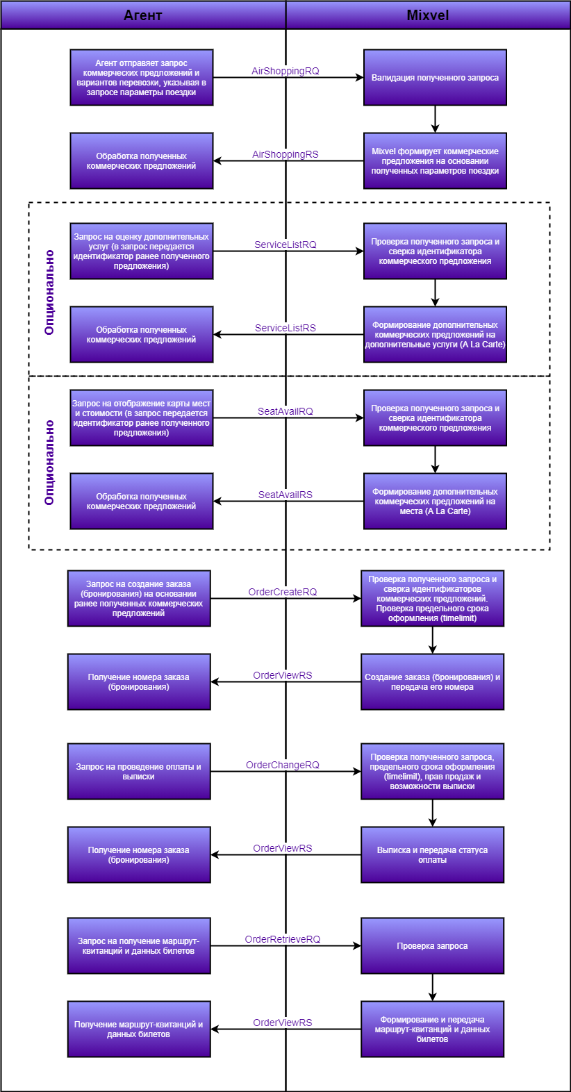 | 2. | Mixvel_AirShoppingRQ / Mixvel_AirShoppingRS | Поиск коммерческих предложений. |