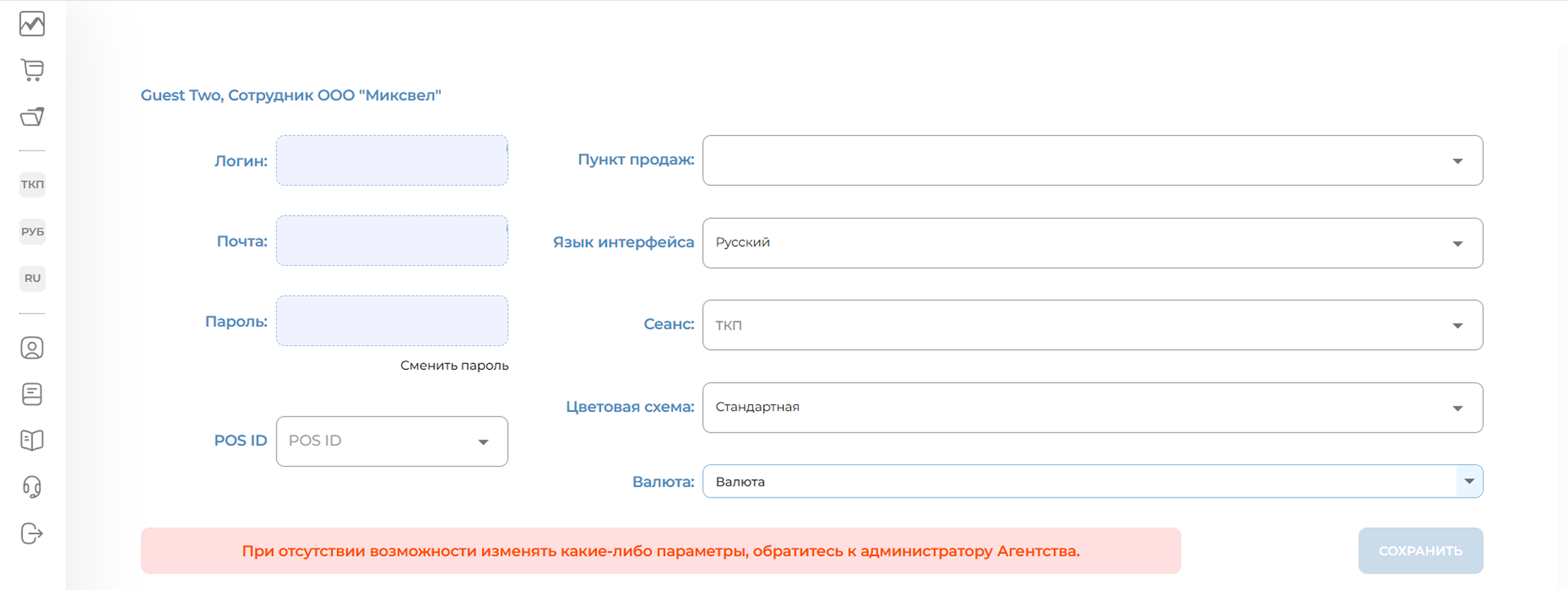 Почта - адрес электронной почты, указанный в карточке пользователя в Личном кабинете агентства MixVel. Изменить невозможно, выводится информационно, смена возможна через запрос администратору Личного кабинета агентства MixVel Босс.