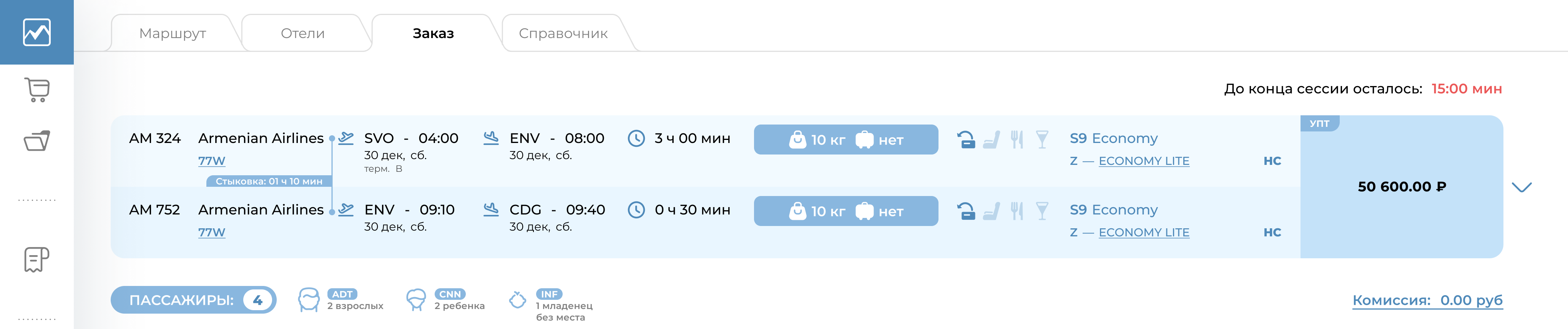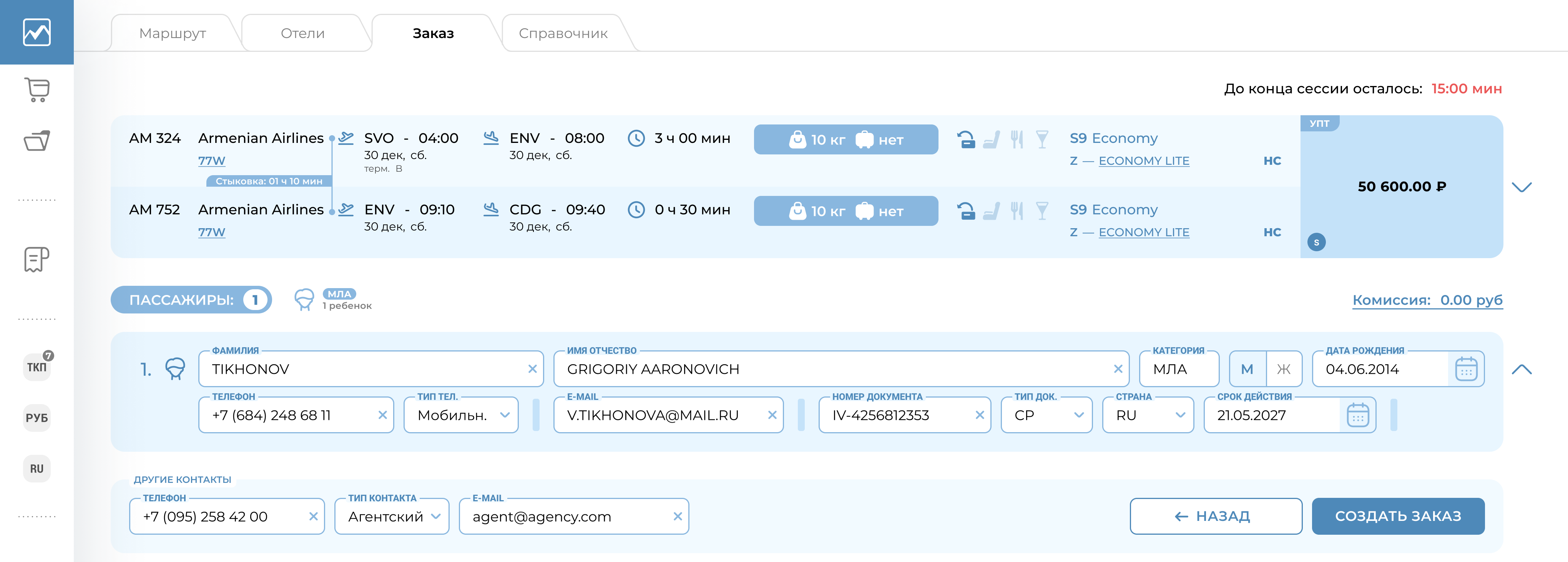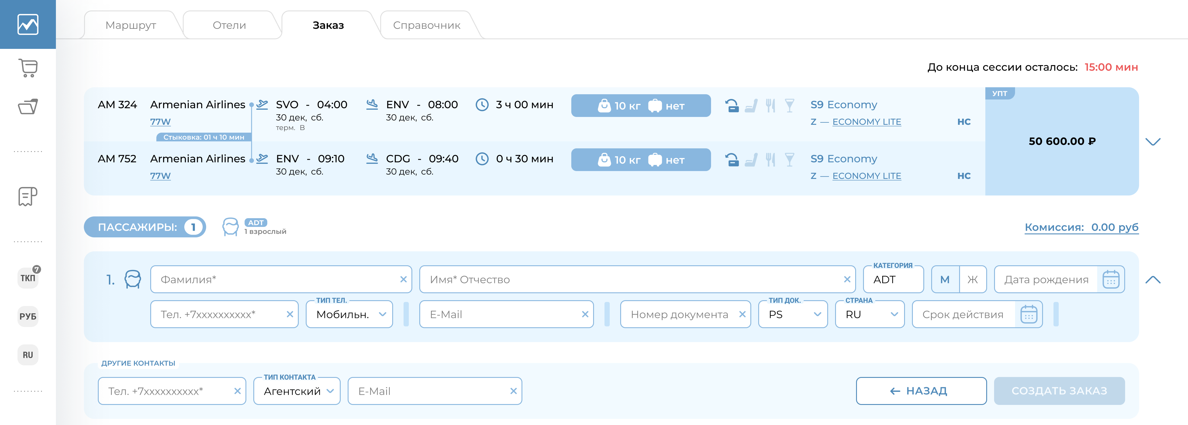 У пользователя есть ограниченное количество минут на внесение минимальных данных для создания заказа. Количество минут на оформления заказа пользователь увидит на экране. Информация маршрута перелета будет соответствовать выбранному предложению.