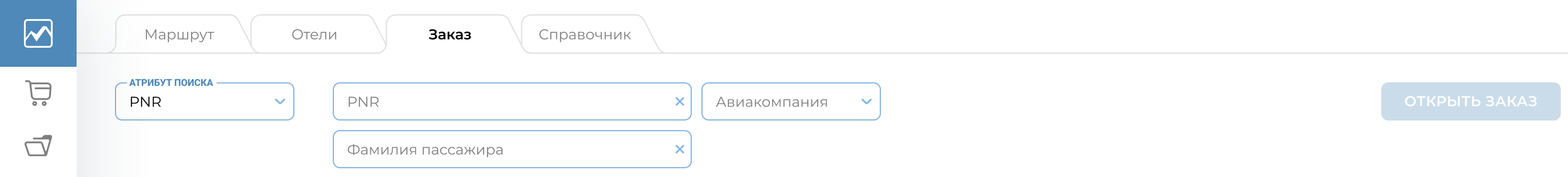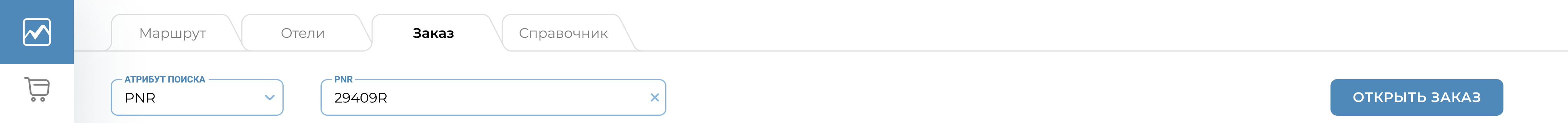 В выпадающем меню пользователю необходимо выбрать пункт «PNR», ввести номер бронирования авиакомпании, в поле «Авиакомпания» ввести код авиакомпании, нажать «Открыть заказ».