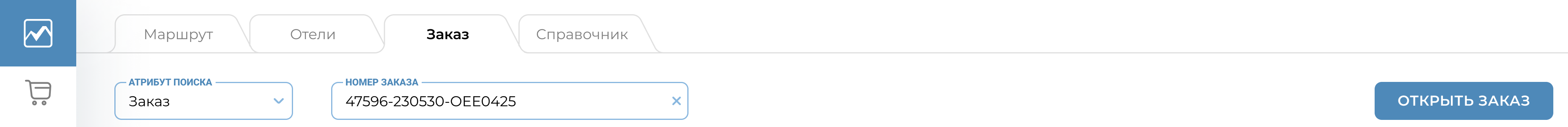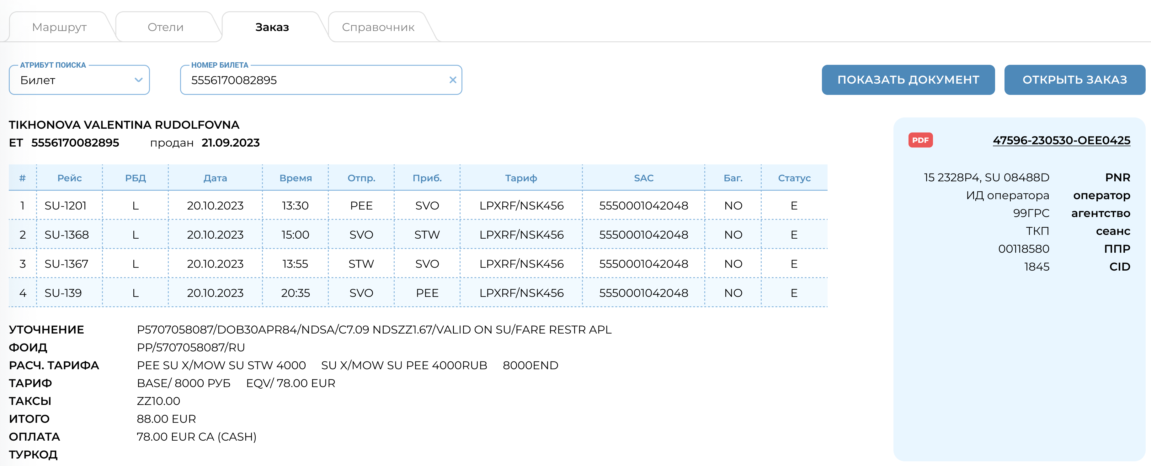 Ранее созданный заказ и оформленный билет могут быть открыты для просмотра и управления из раздела «Заказ» посредством нескольких вариантов запроса.