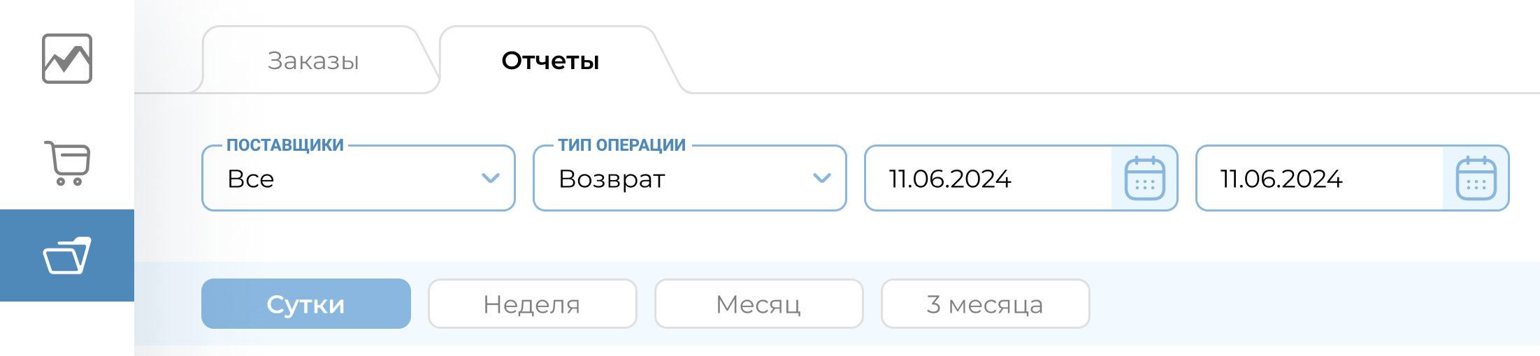 Для формирования и просмотра отчета продаж пользователю необходимо в вертикальном меню Web-приложения MixVel Cashier выбрать раздел «Заказы/Отчеты».