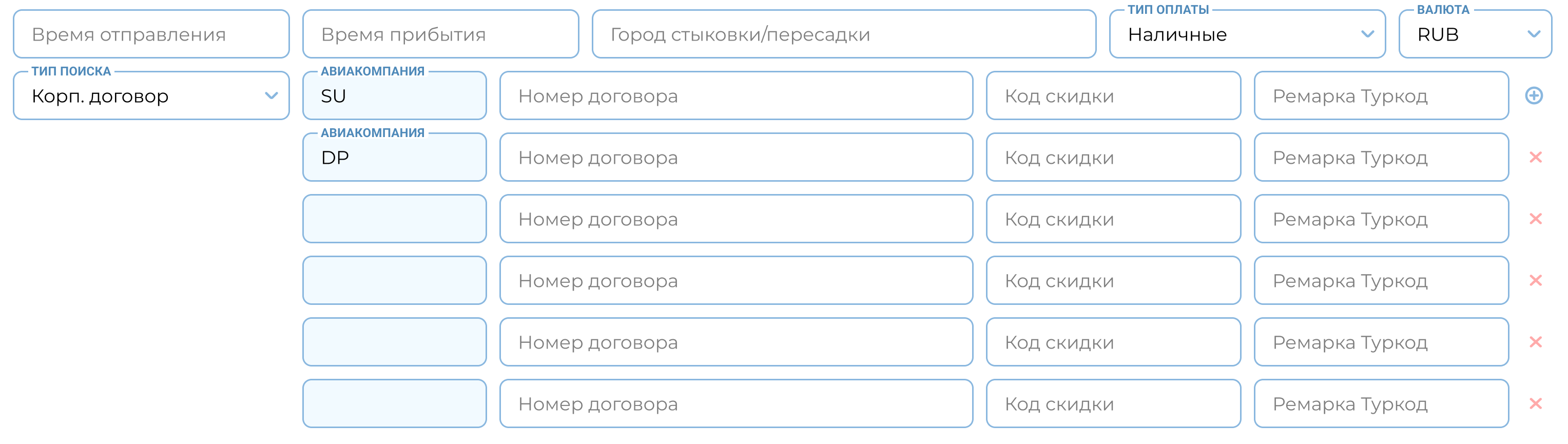 | Тип перелета | Опциональное поле, из выпадающего списка доступны типы: Обычный или Корп.договор. По умолчанию поле заполнено значением «Обычный». При выборе поиска Корп.договор появятся дополнительные поля для ввода данных. Подробнее с поиском Корп.договор можно в разделе «Поиск предложений по трехсторонним (3D) договорам». При нажатии на кнопку «+» возможно добавление нескольких корпоративных договоров. |