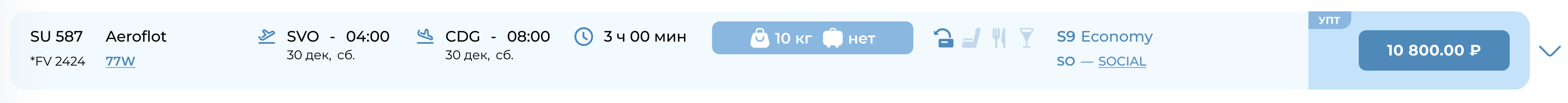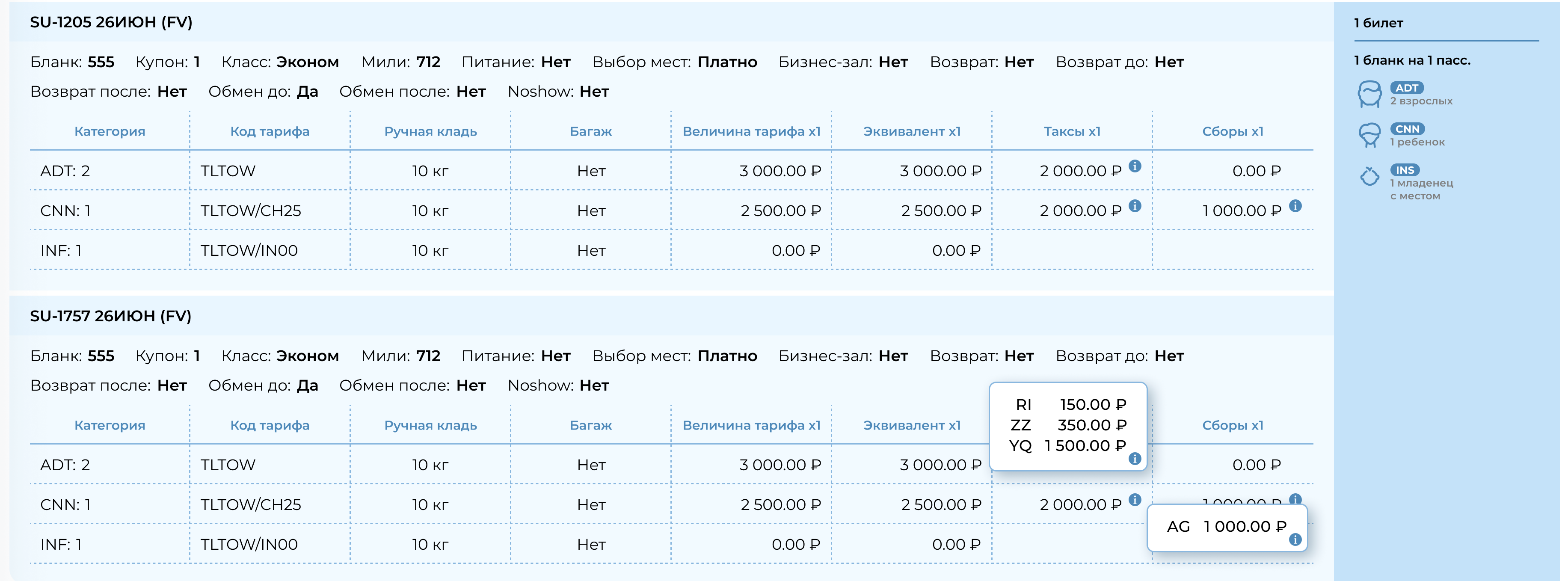2) Предложение — может состоять из из различного количества рейсов. Рейсы одного предложения объединены синей плашкой и расположенными на ней «Кнопкой с ценой» и кнопкой просмотра правил тарифа предложения «УПТ».