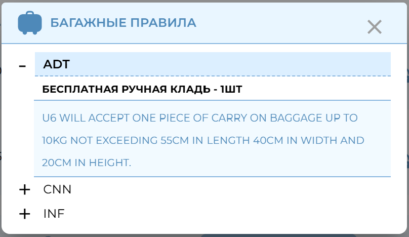 6) Синее информационное поле «Норма ручной клади и багажа» является кликабельным. Пользователь может посмотреть подробную информацию для всех категорий пассажиров поиска: все возможные варианты багажа по конкретной норме, а также варианты не входящие в норму бесплатного провоза багажа. Информационное поле отображает норму старшей возрастной категории поиска.