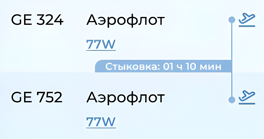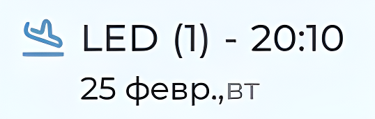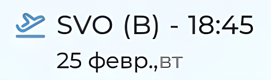| Время отправления | Время отправления — опциональное поле, определяющее время вылета от/до, заполняется в формате ЧЧ:ММ-ЧЧ:ММ. Фильтр работает на интервал времени отправления первого рейса в поиске. |