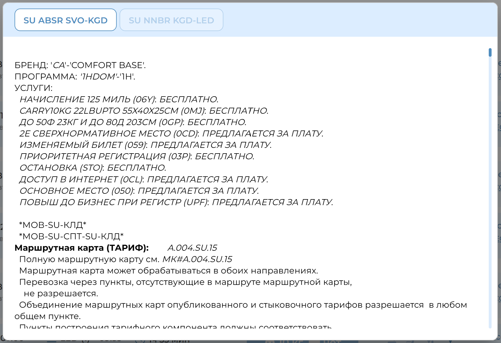 Для того, чтобы узнать условие применения тарифа (УПТ), пользователю необходимо нажать кнопку УПТ в предложенных результатах поиска маршрута, в выбранном предложении для оформления заказа или в созданном заказе. Пользователю откроется всплывающее окно с условиями применения тарифа на выбранном сегменте. В случае, когда сегментов несколько, пользователю доступно ознакомления с УПТ на каждый сегмент предложения, путем переключения между вкладками, расположенными в верхней части всплывающего окна.