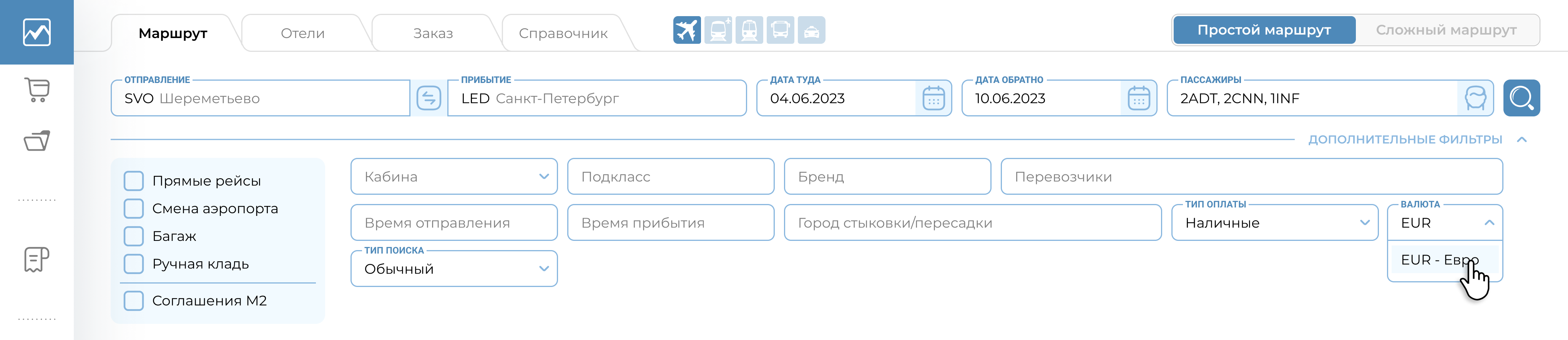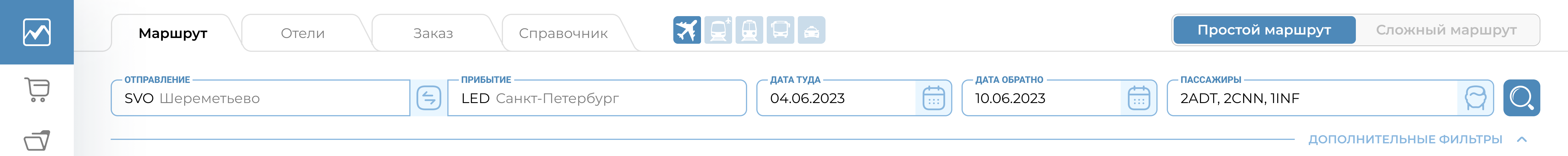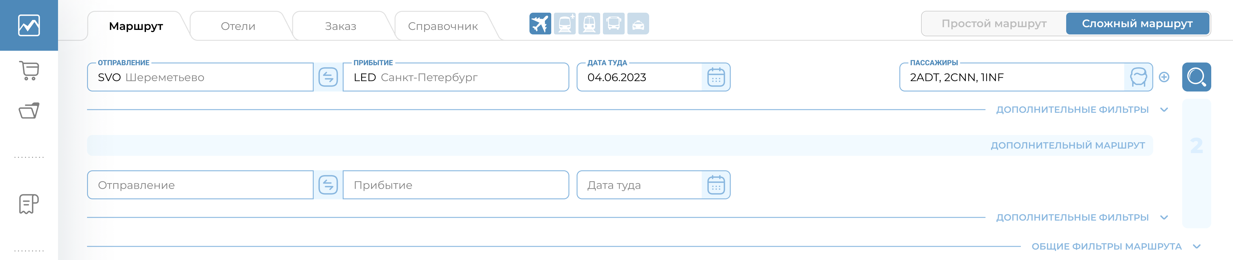 Простой маршрут предполагает поиск одного направления, только туда или туда-обратно. Поиск возможен при заполнении четырех обязательных полей. Дополнительные параметры поиска вынесены в отдельные поля и заполняются опционально. Благодаря им поиск можно сделать более точным с учетом запросов конкретного клиента.