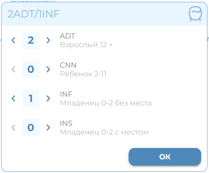 Дополнительно доступен выбор категорий пассажиров из списка часто используемых категорий. Раскрыть список часто используемых категорий пользователь может кликом на иконку человека. Рядом с каждой категорией пользователю доступно управление количеством пассажиров категории.