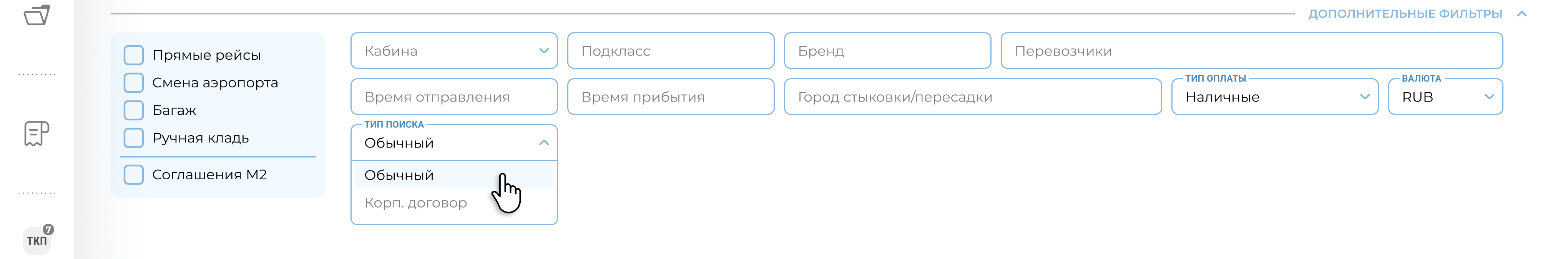Для поиска предложений с конфиденциальными скидками по корпоративным договорам пользователь должен изменить тип поиска, выбрав в специальном поле дополнительных параметров «Тип поиска» пункт «Корп.договор».