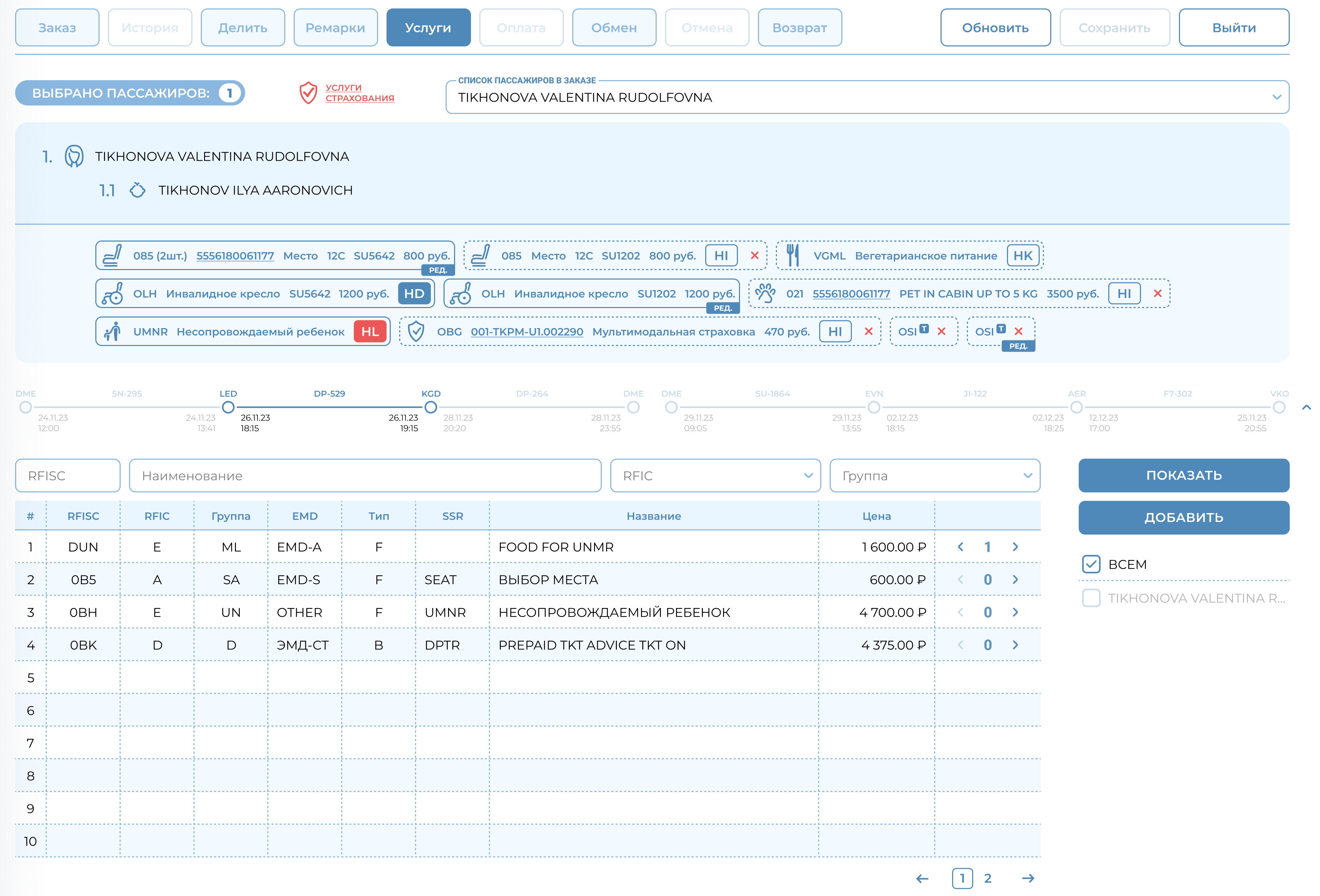 Статусы добавленных услуг будут отражены в блоке пассажира в информации об услугах на страницах: Услуги, Ремарки, Оплата.