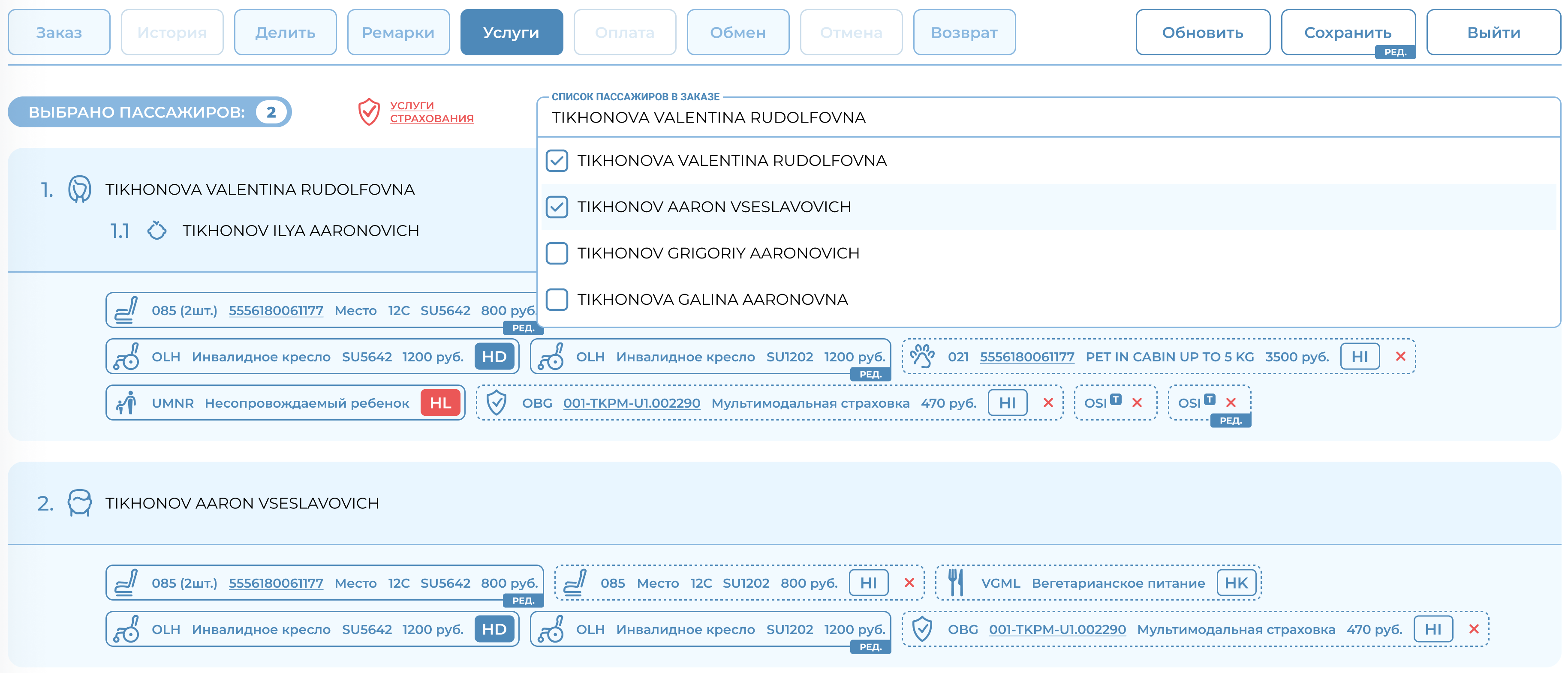 2) Под кнопкой «Добавить» выбрать пассажиров, которым будут добавлены услуги, проставляя галочки нужным пассажирам;