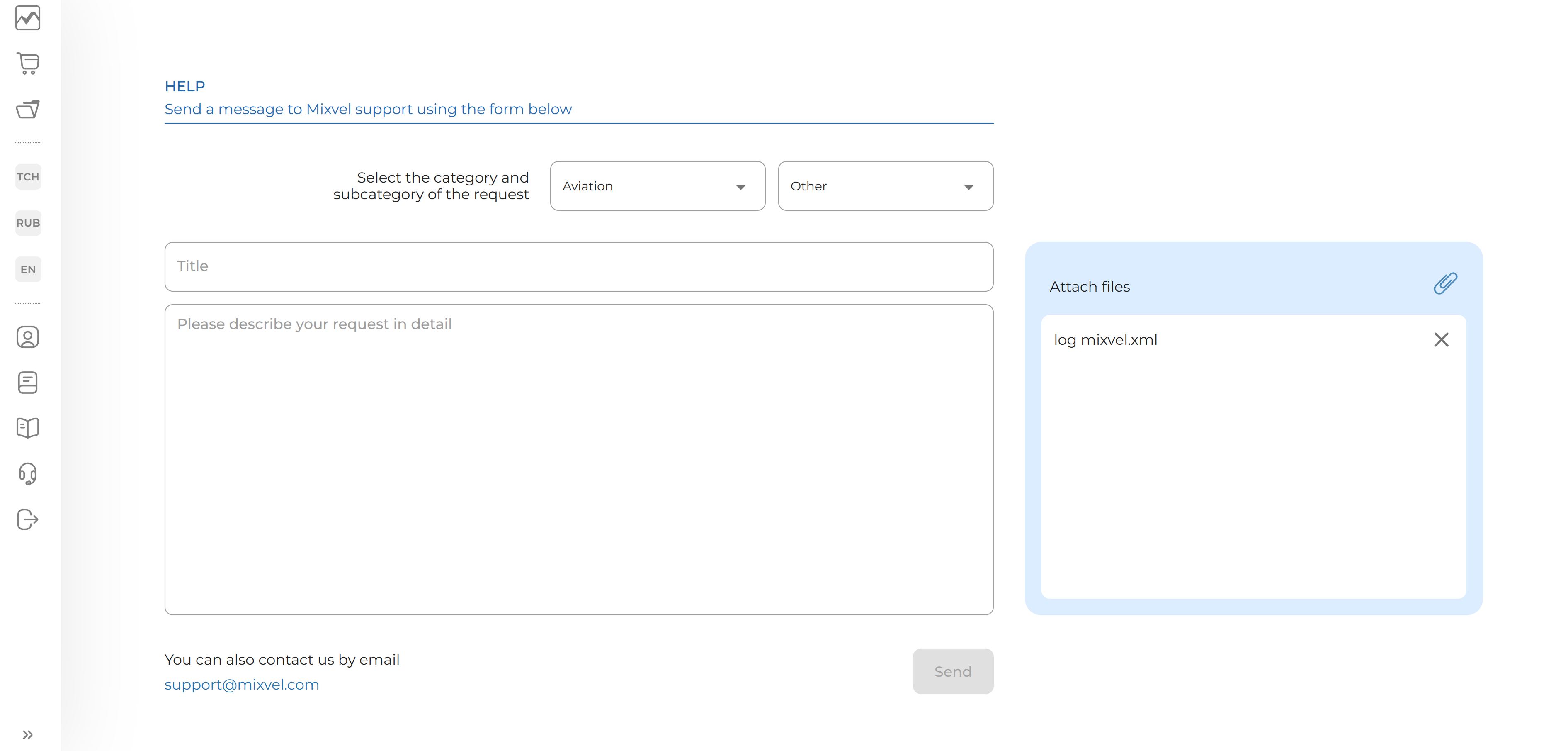 The user can also attach files to the request (screenshots or other). The maximum size of each file is limited to 100 MB. Up to 10 files can be attached to one request.
