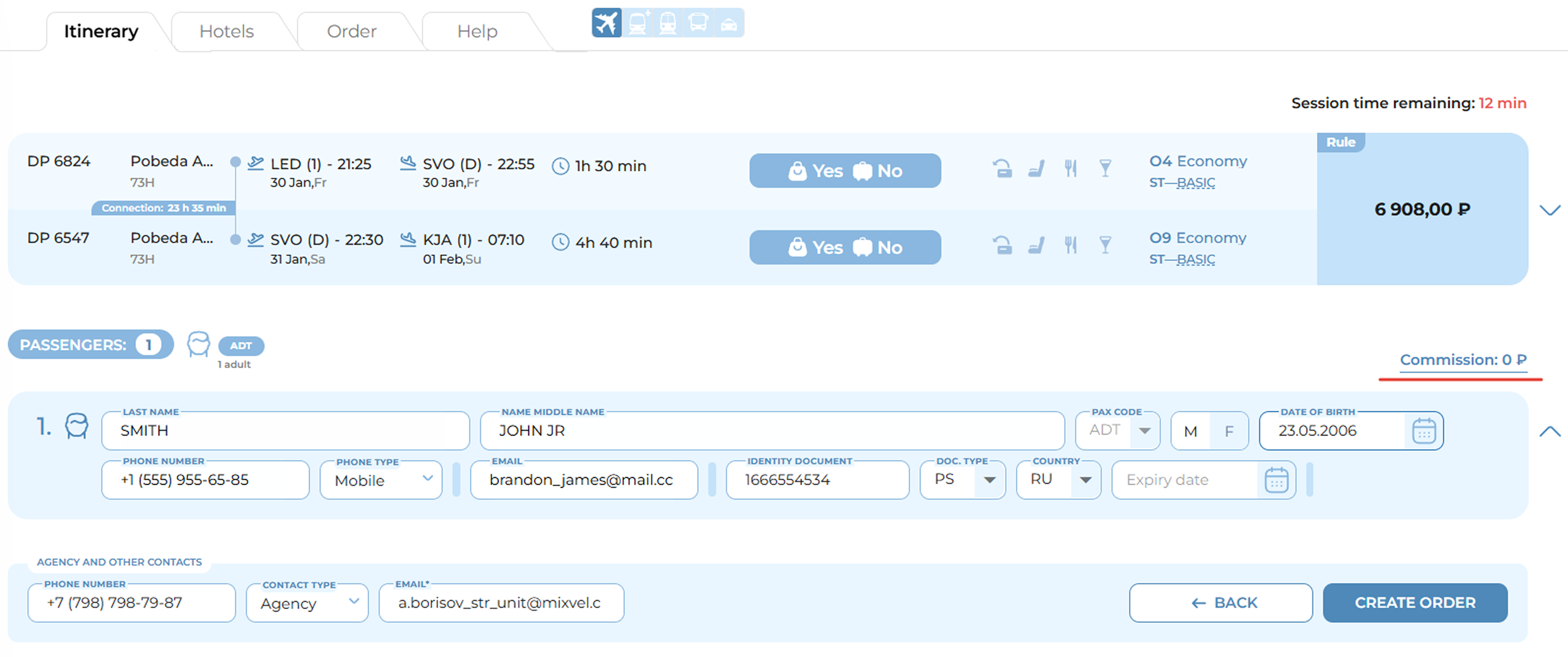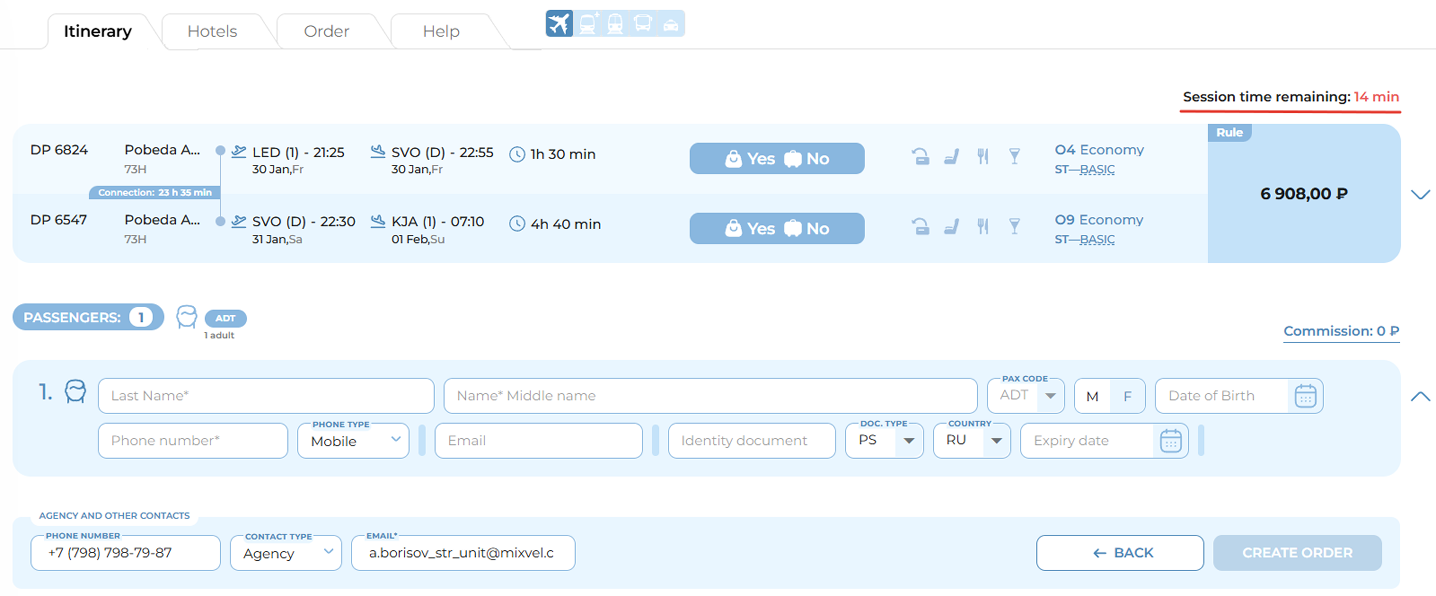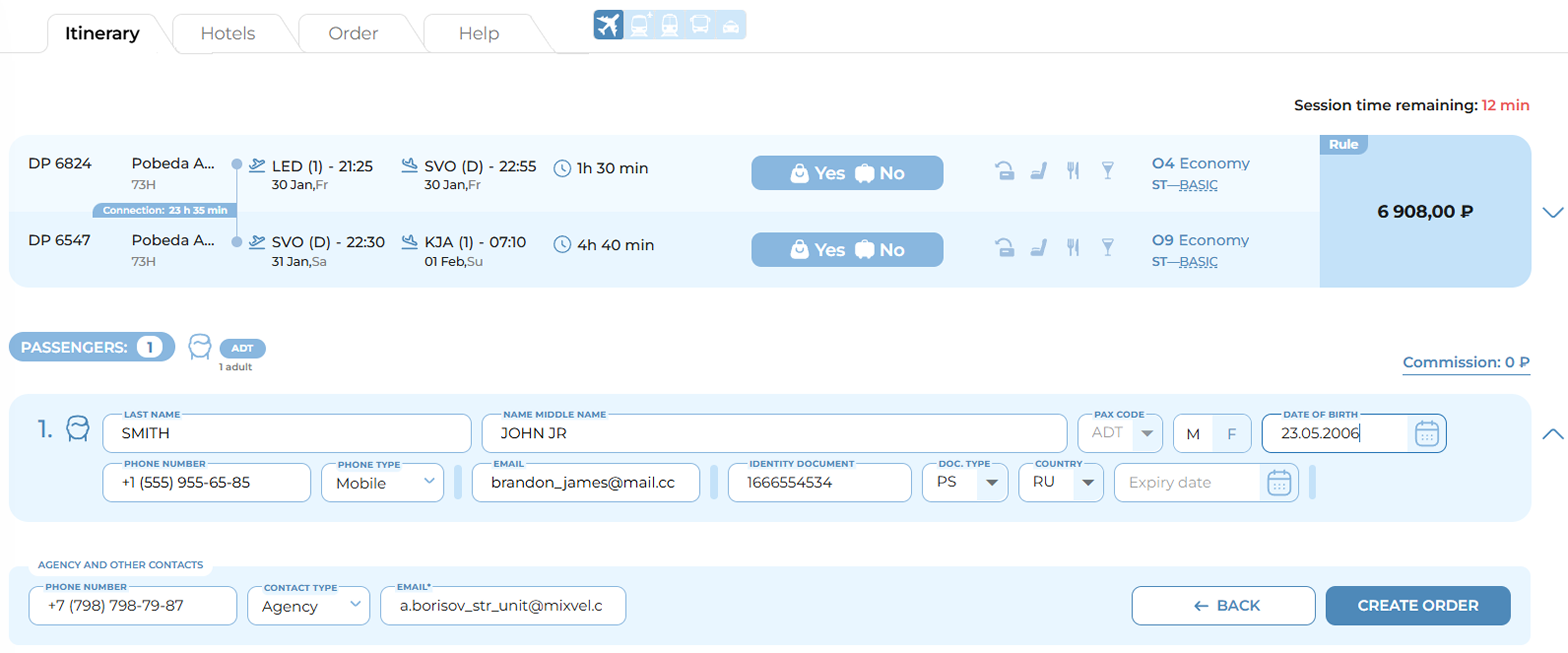 The user is granted a limited amount of time — clearly shown on the screen — to provide the minimum required passenger information to complete the booking. The itinerary details displayed during this process always match the originally selected offer without any modifications.