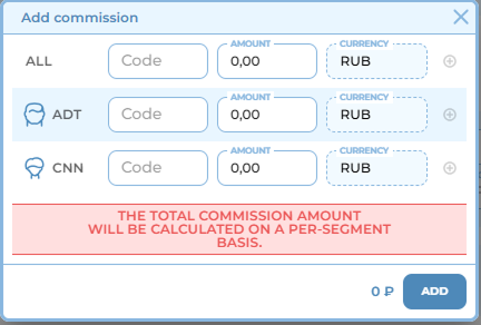 If commissions are added both for all passengers and for a specific passenger category, passengers in that category will have two commission amounts applied: the amount defined for all passengers plus the amount defined for their specific category.