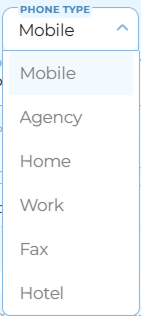 - Mobile Phone – Mandatory for the first passenger only and optional for all other passengers. The booking cannot be saved unless at least one seated passenger has a valid mobile number provided. The mobile number field accepts international phone numbers consisting of 11 to 15 digits. Additionally, the user may optionally add another type of phone number for any passenger by selecting the number type (e.g., home, work, etc.) from a dropdown list “Phone type”.