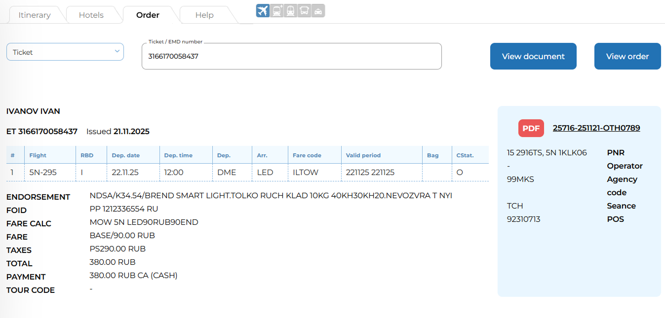 - Click the «View Document» button to open the ticket document (commonly called the «e-ticket» or «EMD receipt») without access to order management.