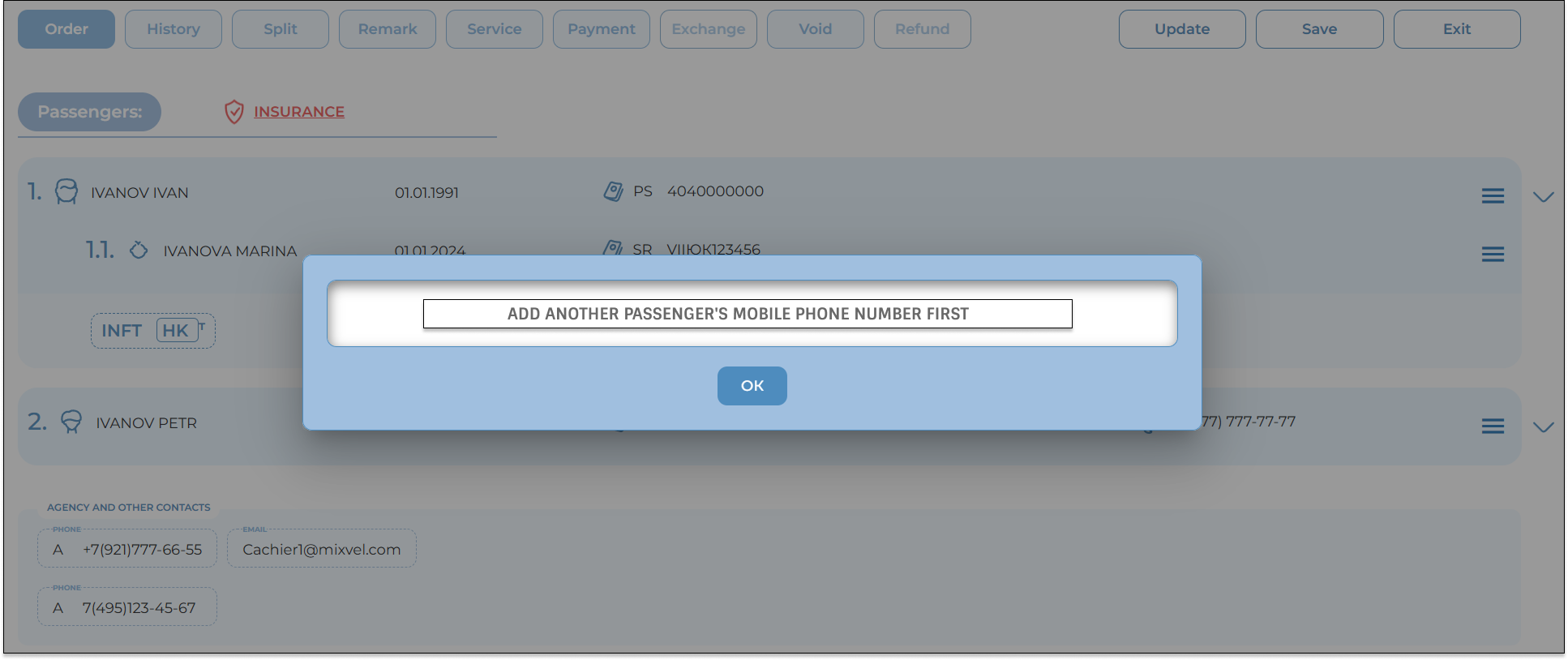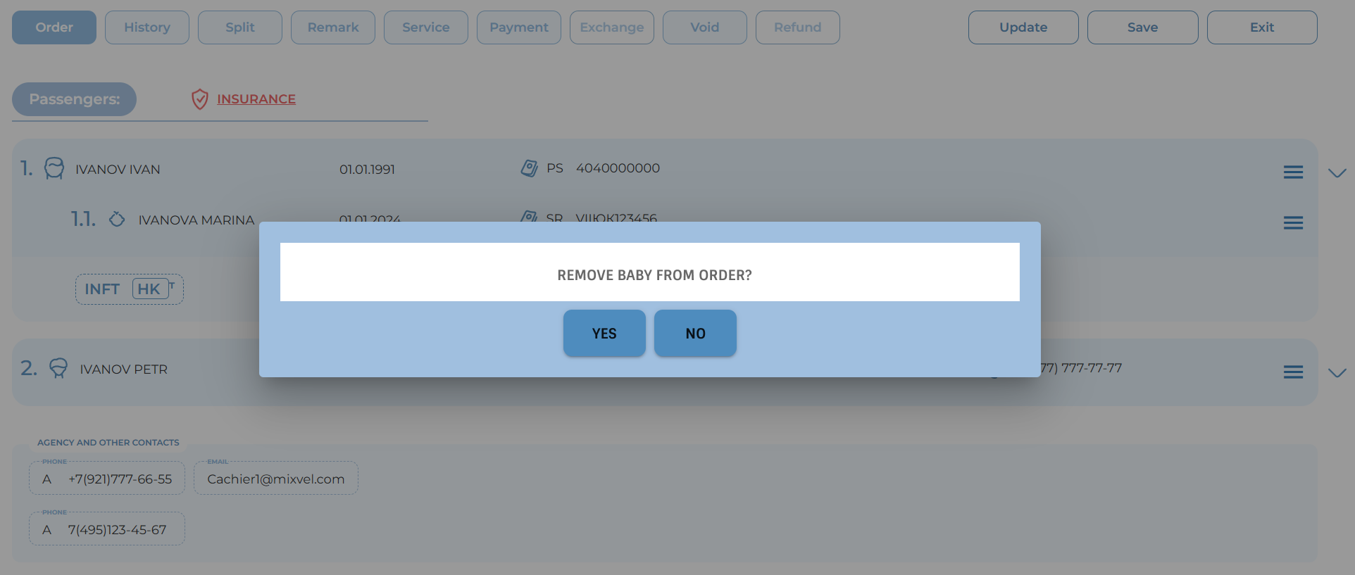 In the MixVel Cashier web application, the user can remove an infant (a passenger without a seat) from the booking before payment. To do this, the user must select “Delete Infant” from the context menu of the infant passenger and confirm the deletion.