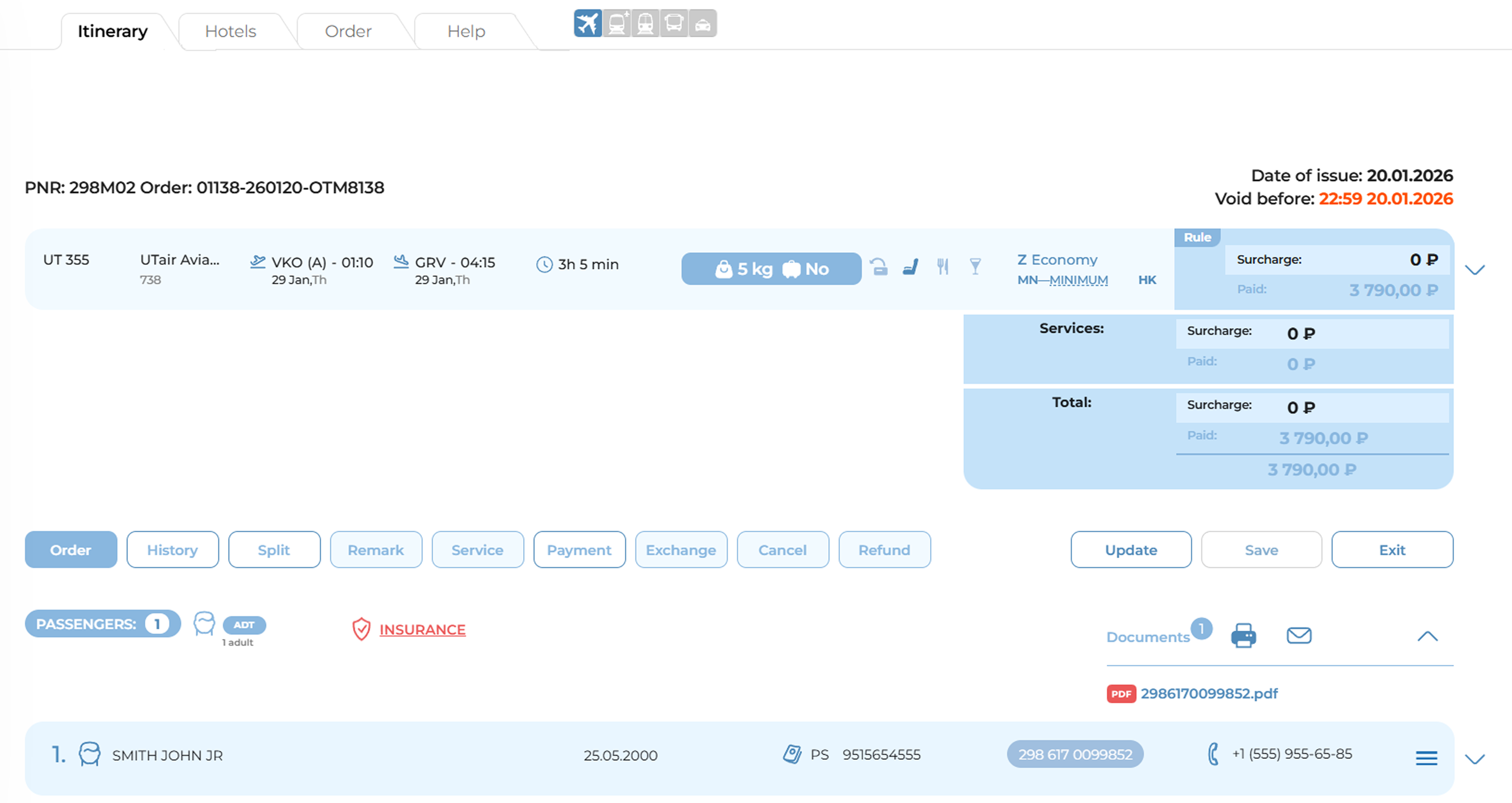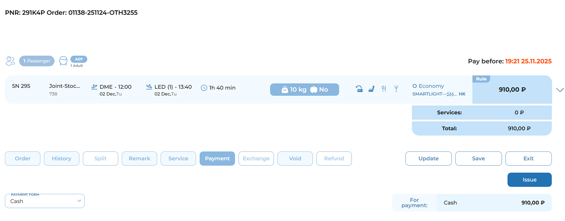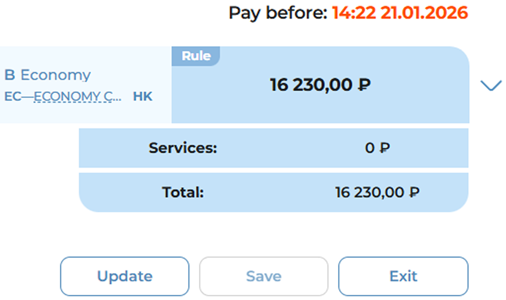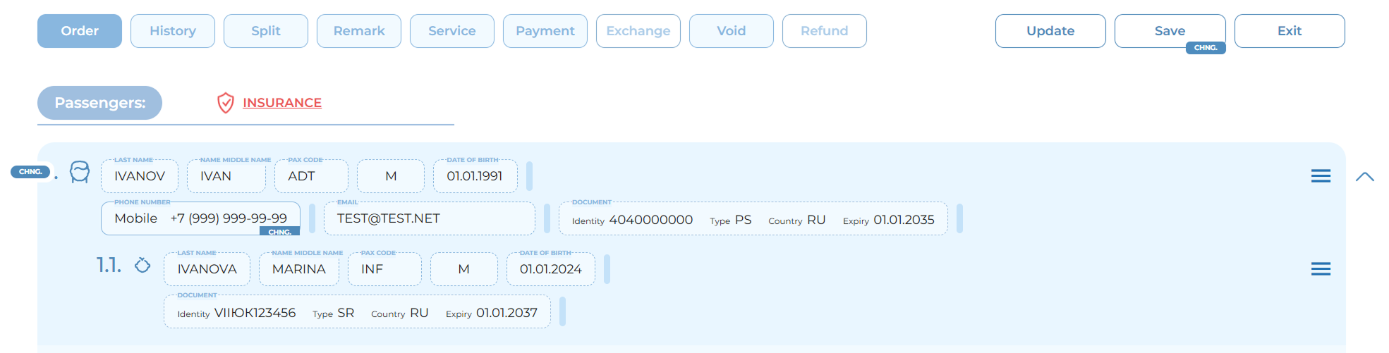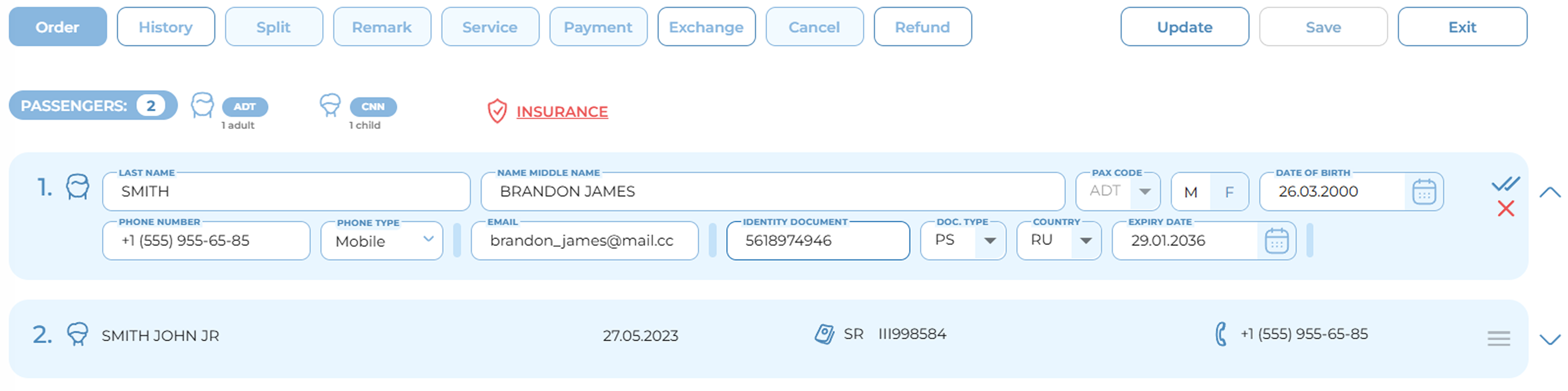 Editing a passenger’s personal details after payment is only possible through the ticket exchange process. See section “Ticket Exchange. Changing Passenger Details After Payment.”