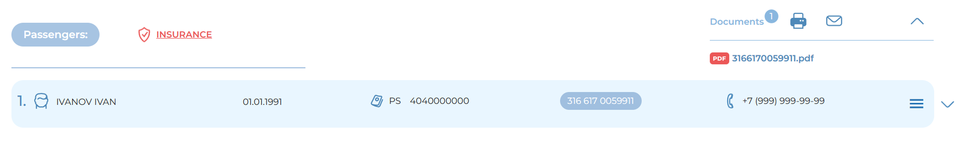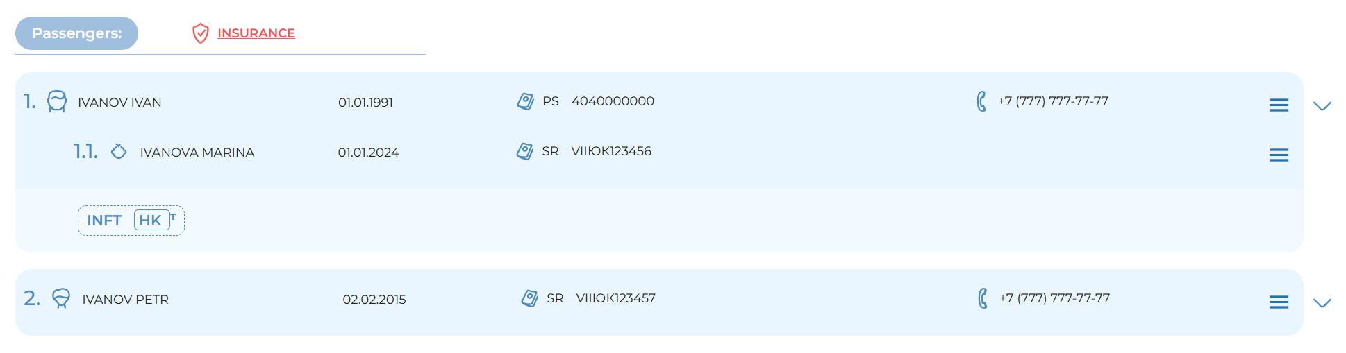 Passenger context menu – represented by a “hamburger” icon (three horizontal lines) within each passenger block, allowing management of passenger-specific data
