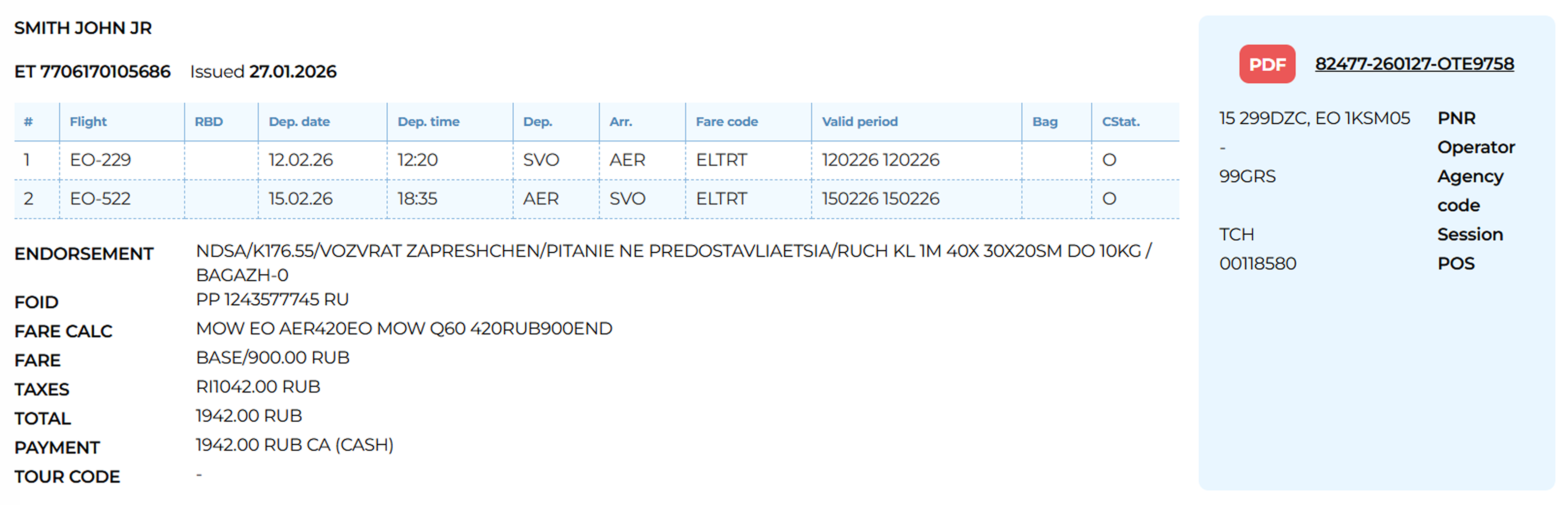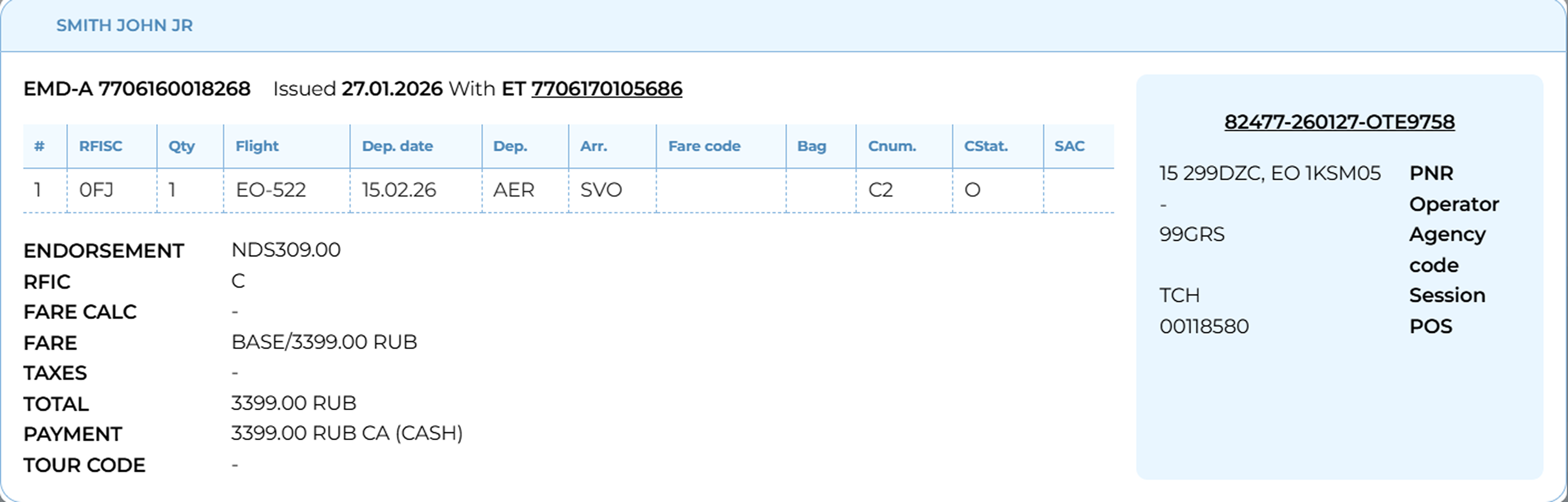 In a paid booking, ticket numbers and EMDs (Electronic Miscellaneous Documents) — if applicable — will appear.