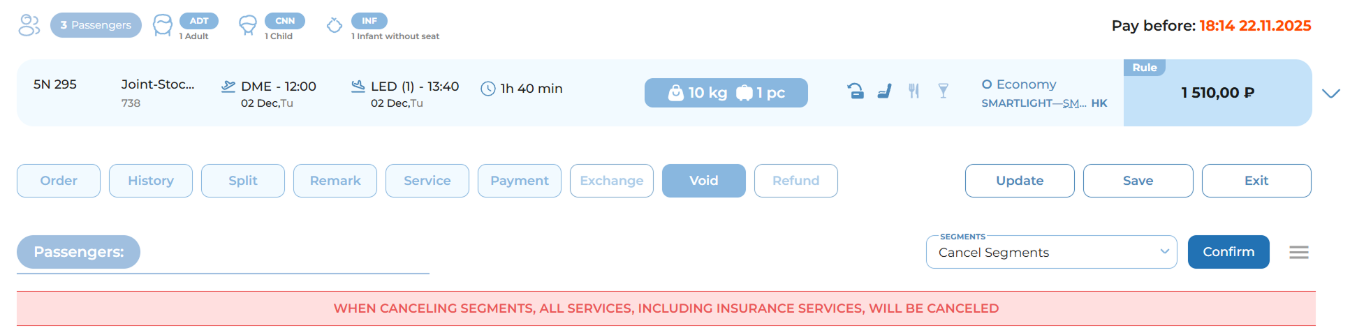 Delete segments: Cancels and permanently removes the segments from the booking.