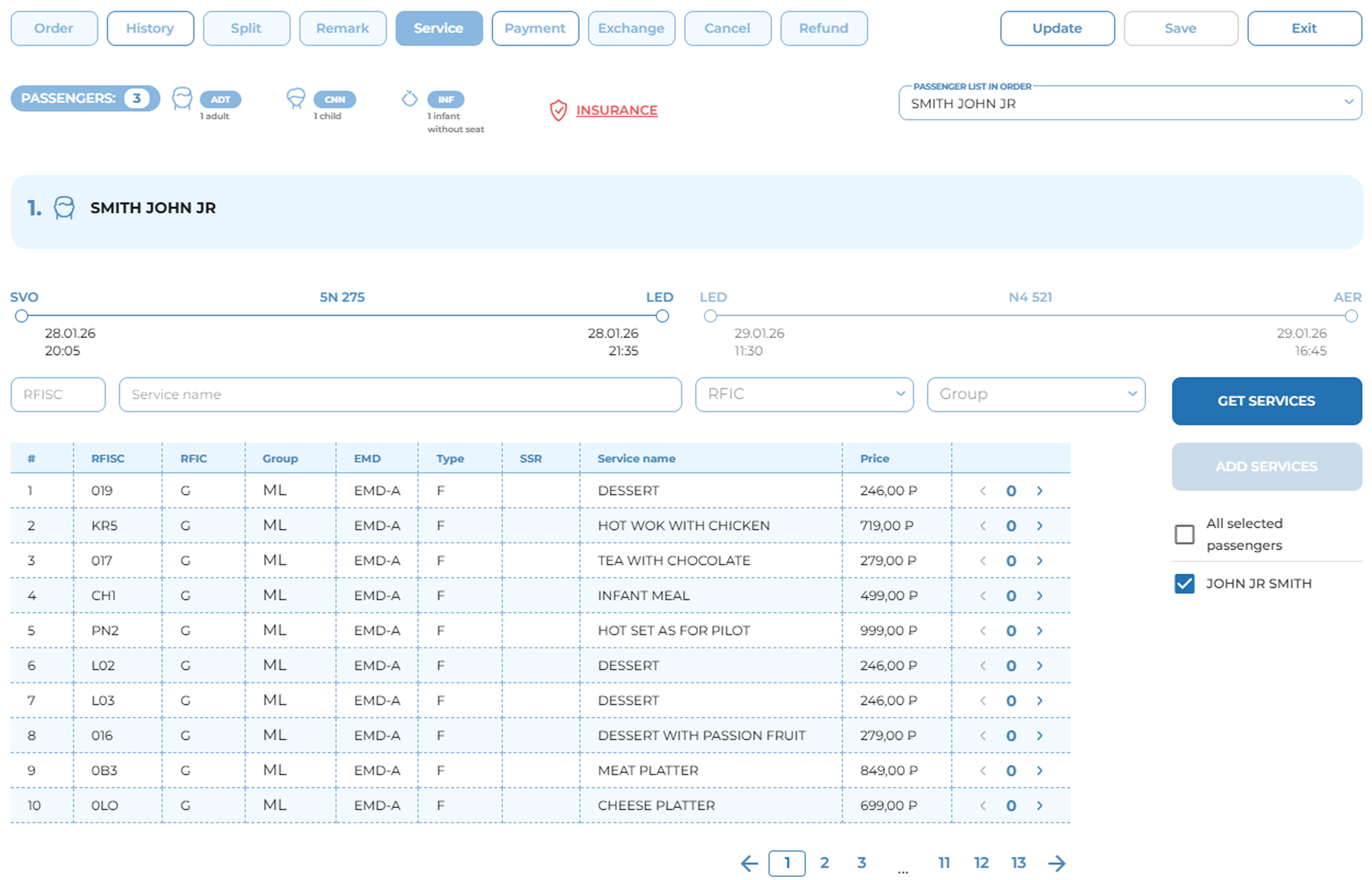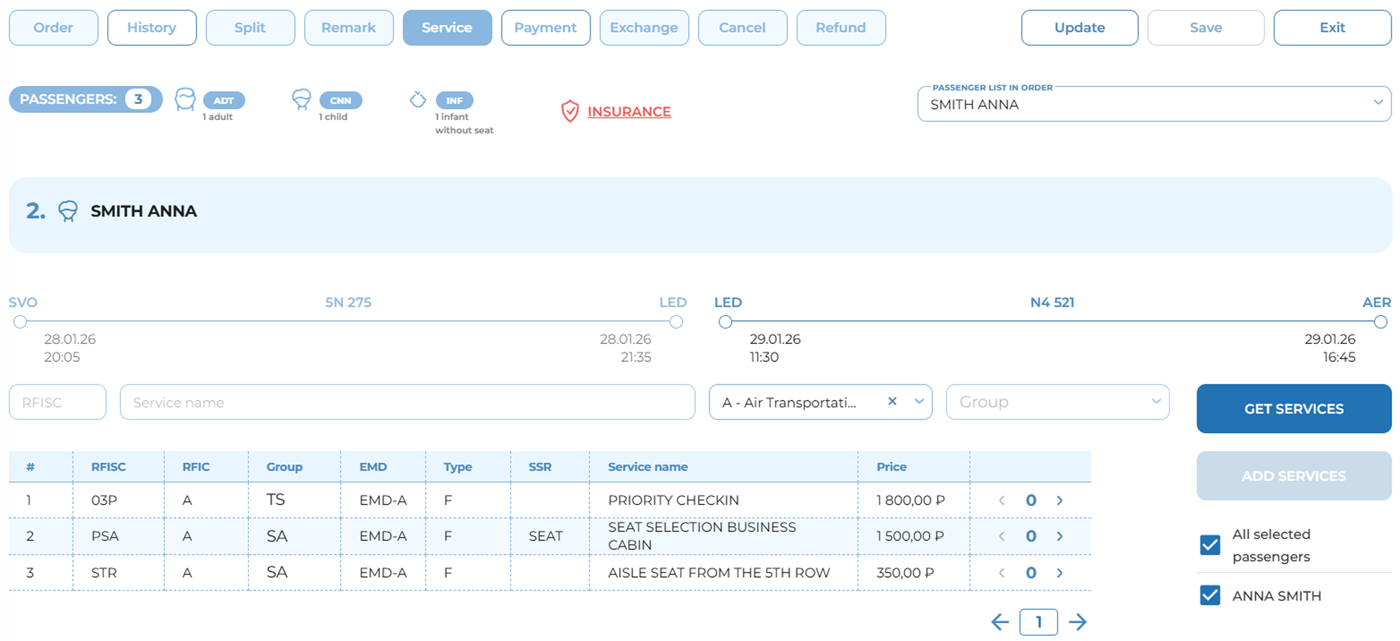 To view the list of all available ancillary services, the user must open an order with confirmed flight segments and navigate to the «Service» tab.