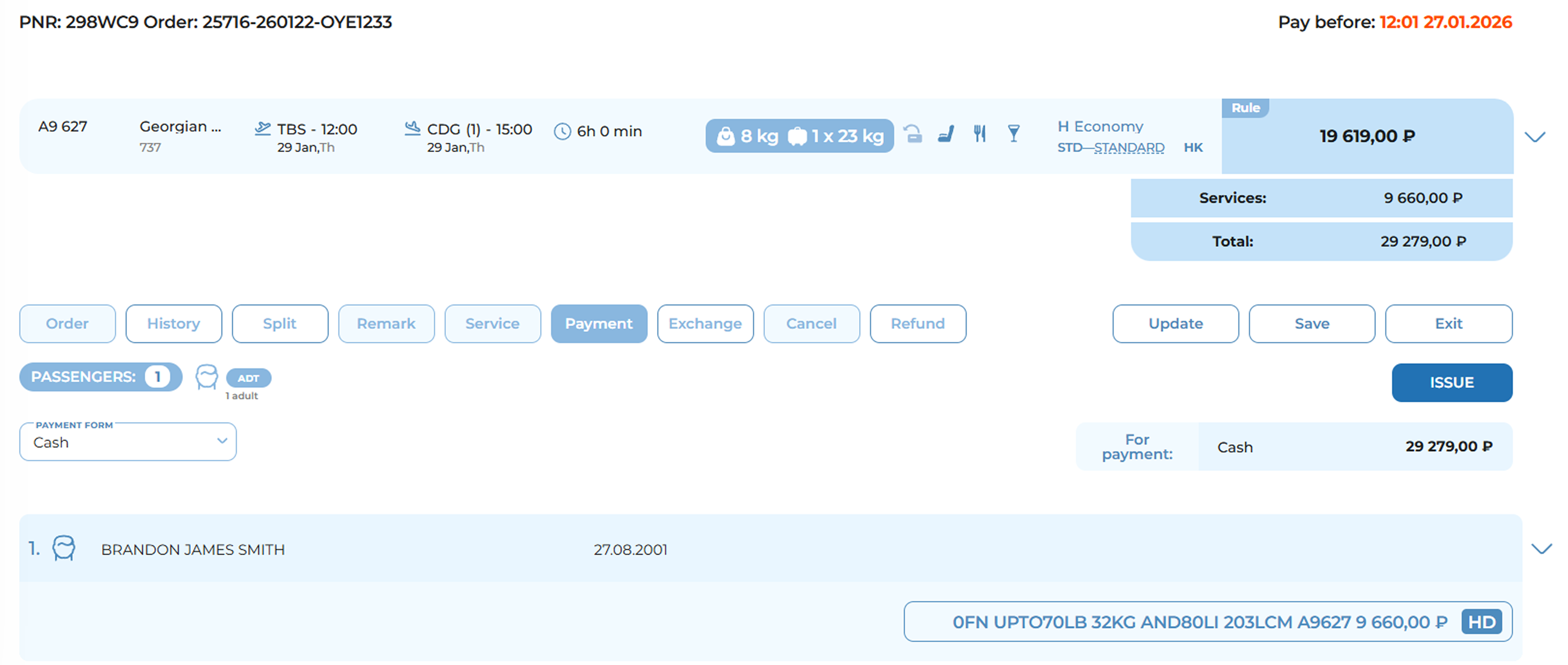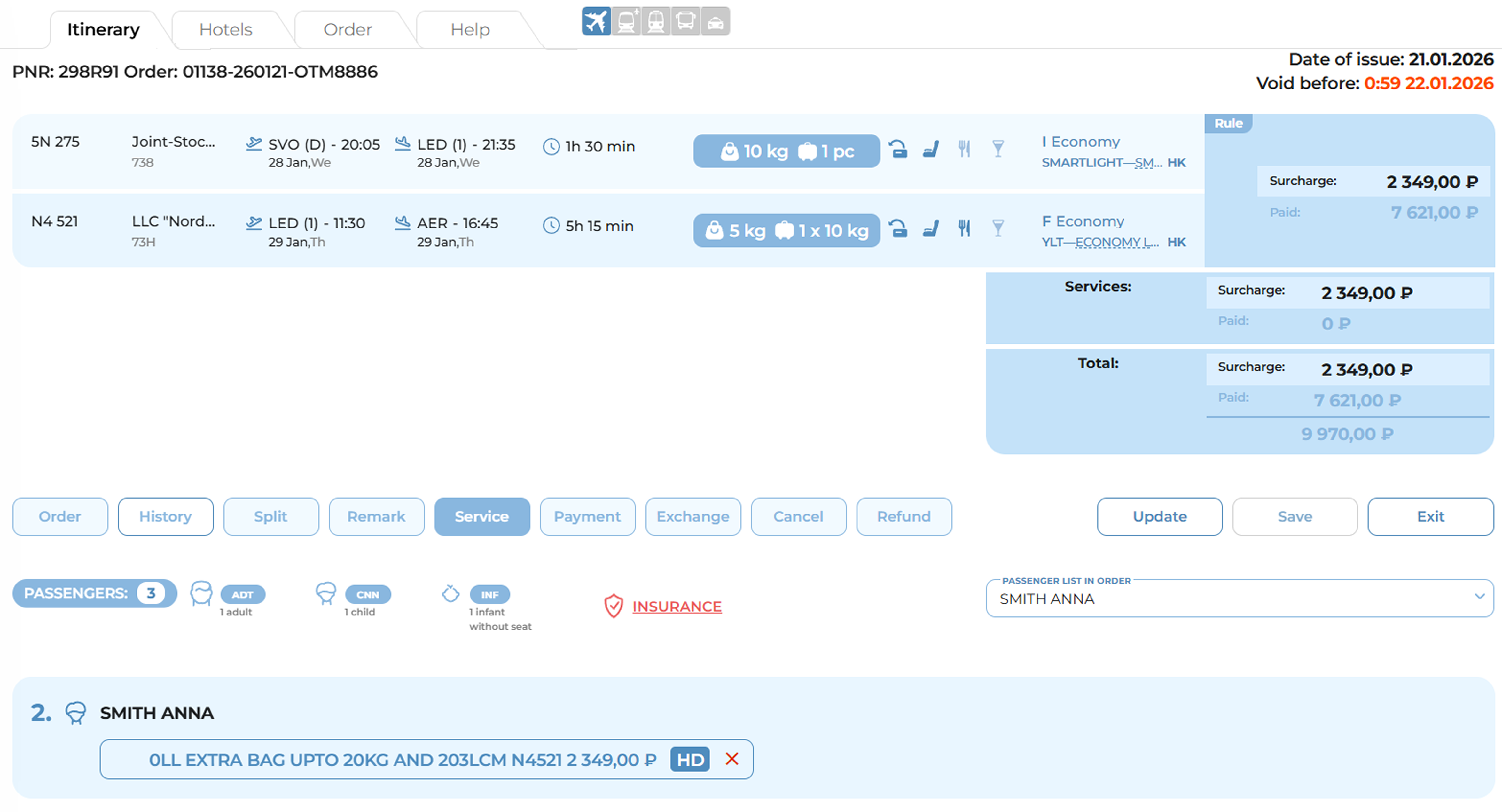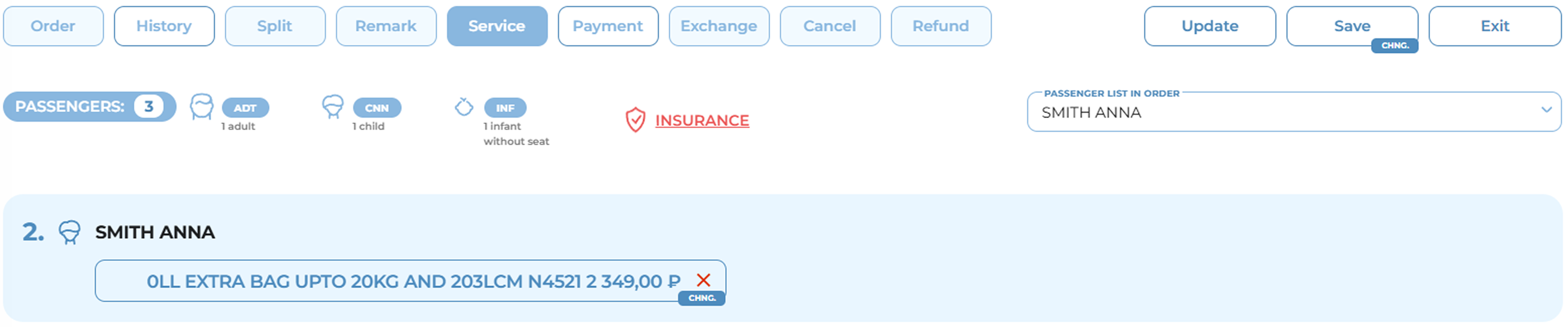 The «Service» section, accessible from the Order Management Panel, allows the user to manage ancillary air-travel services such as excess baggage, paid seating, group deposits, and more.