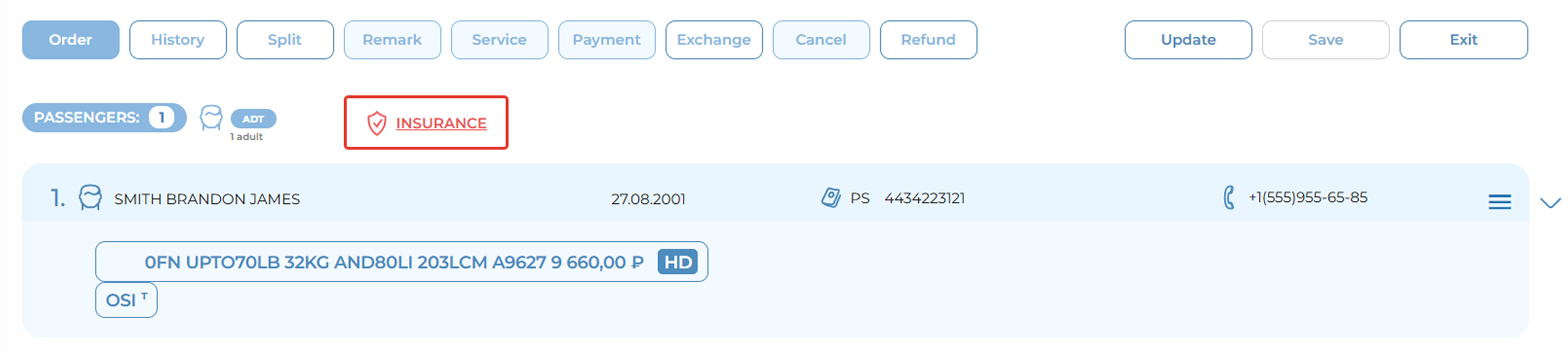 To add an insurance service to an existing order, the user must click the "Insurance" button, located either in the Order section or the Service section.