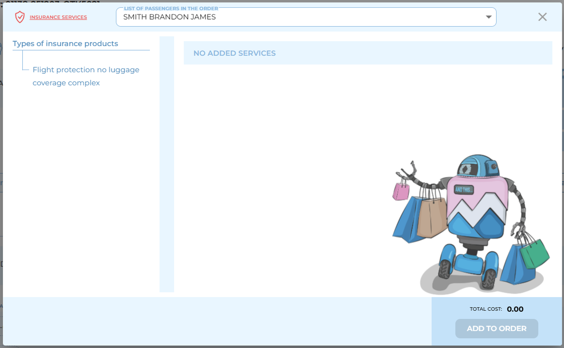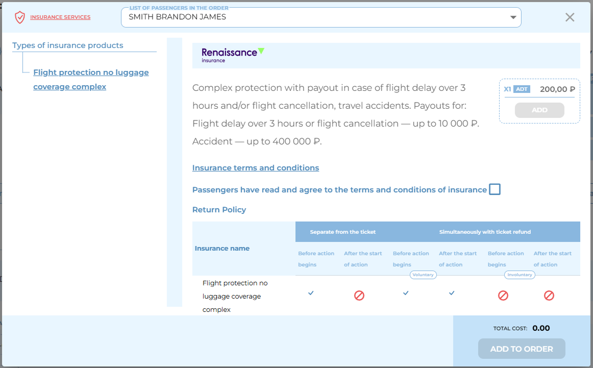 After selecting a specific passenger or all passengers, a list of insurance products suitable for the order becomes available to the user.