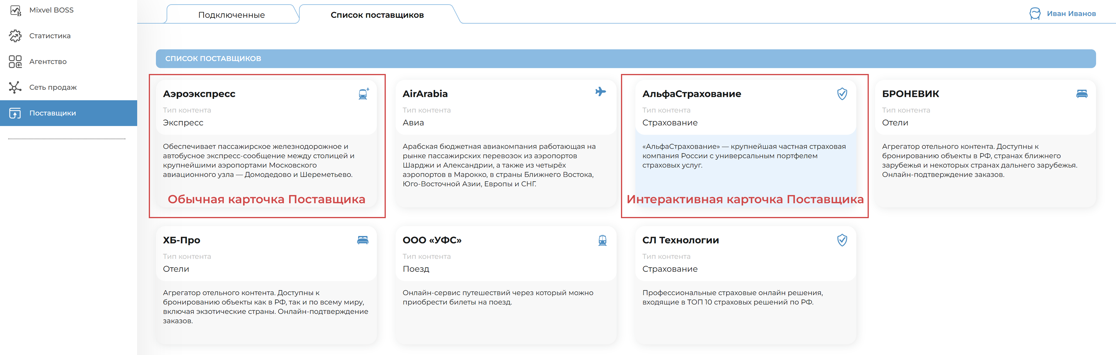 Список Поставщиков имеет как интерактивные карточки, с которыми Агент может взаимодействовать, так и обычные карточки, которые означают что данный Поставщик не требует взаимодействия с Агентом, такие Поставщики подключены по умолчанию (Рисунок 2). Интерактивные карточки подсвечиваются при наведении курсора.