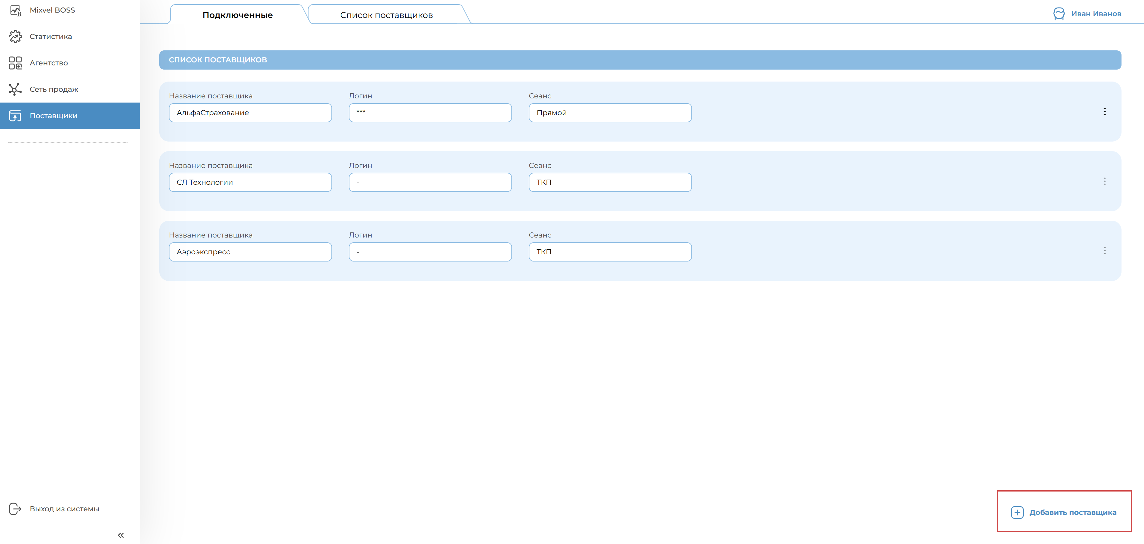 Рисунок 4. Добавление Поставщика в разделе «Подключенные»