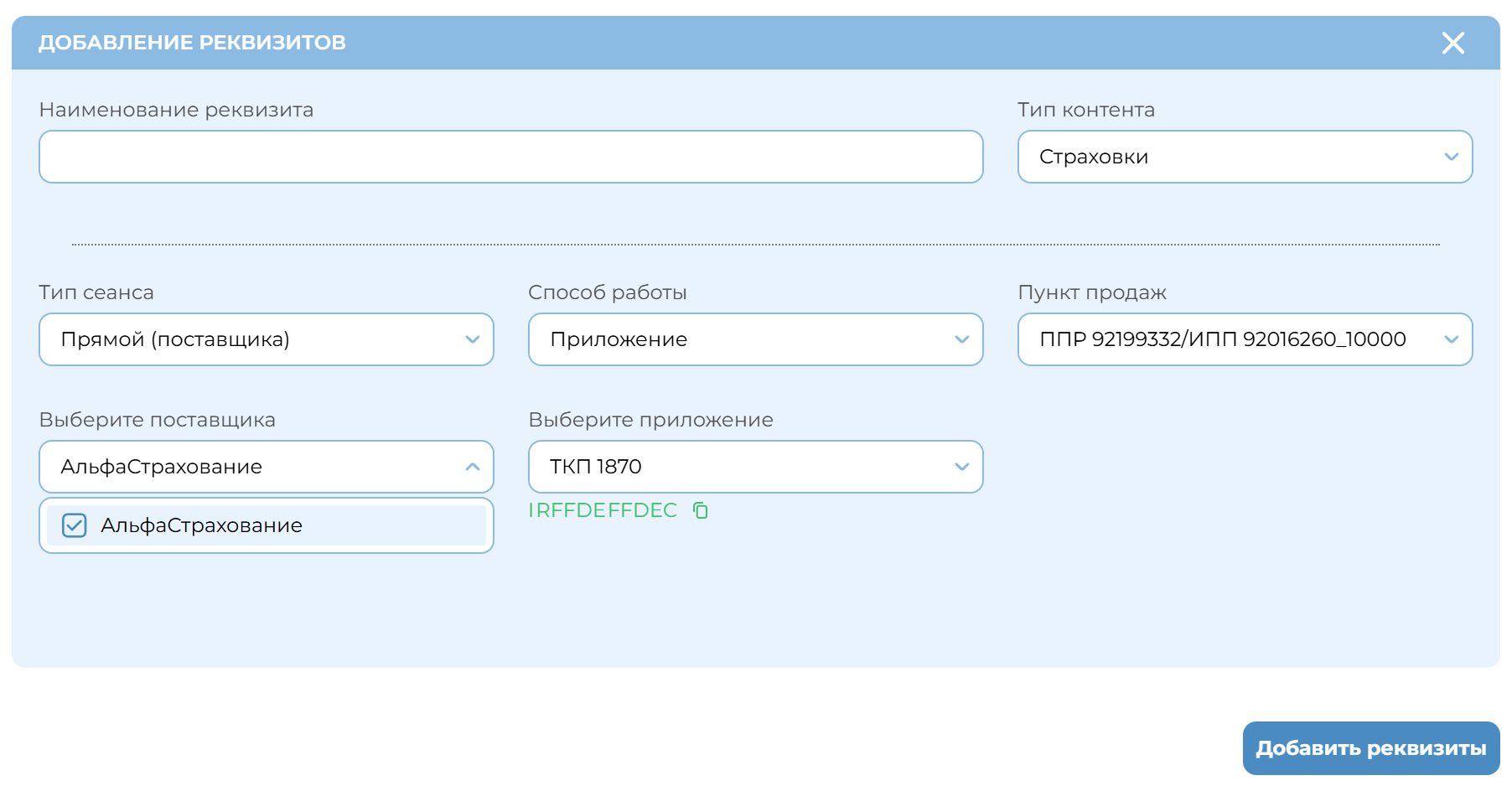 «Тип контента» отображается в зависимости от того, какого Поставщика подключил Агент. Например, если подключен Поставщик «АльфаСтрахование», то при создании реквизита будет доступен «Тип контента» Страховки. Если подключен Поставщик «Броневик», то при создании реквизита будет доступен «Тип контента» Отели.