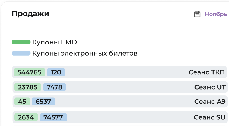 отображение количества купонов с разделением по подключенным у Агентства сеансам;