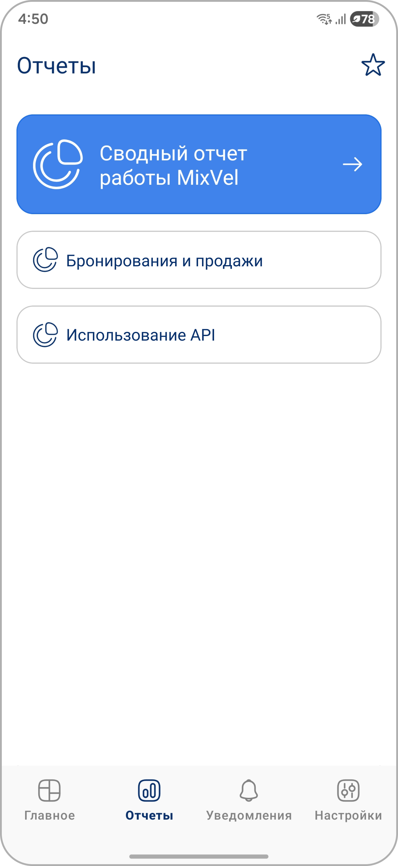 Экран «Отчеты» содержит список доступных отчетов. Есть возможность включить фильтр «избранных отчетов», который настраивается индивидуально пользователем.