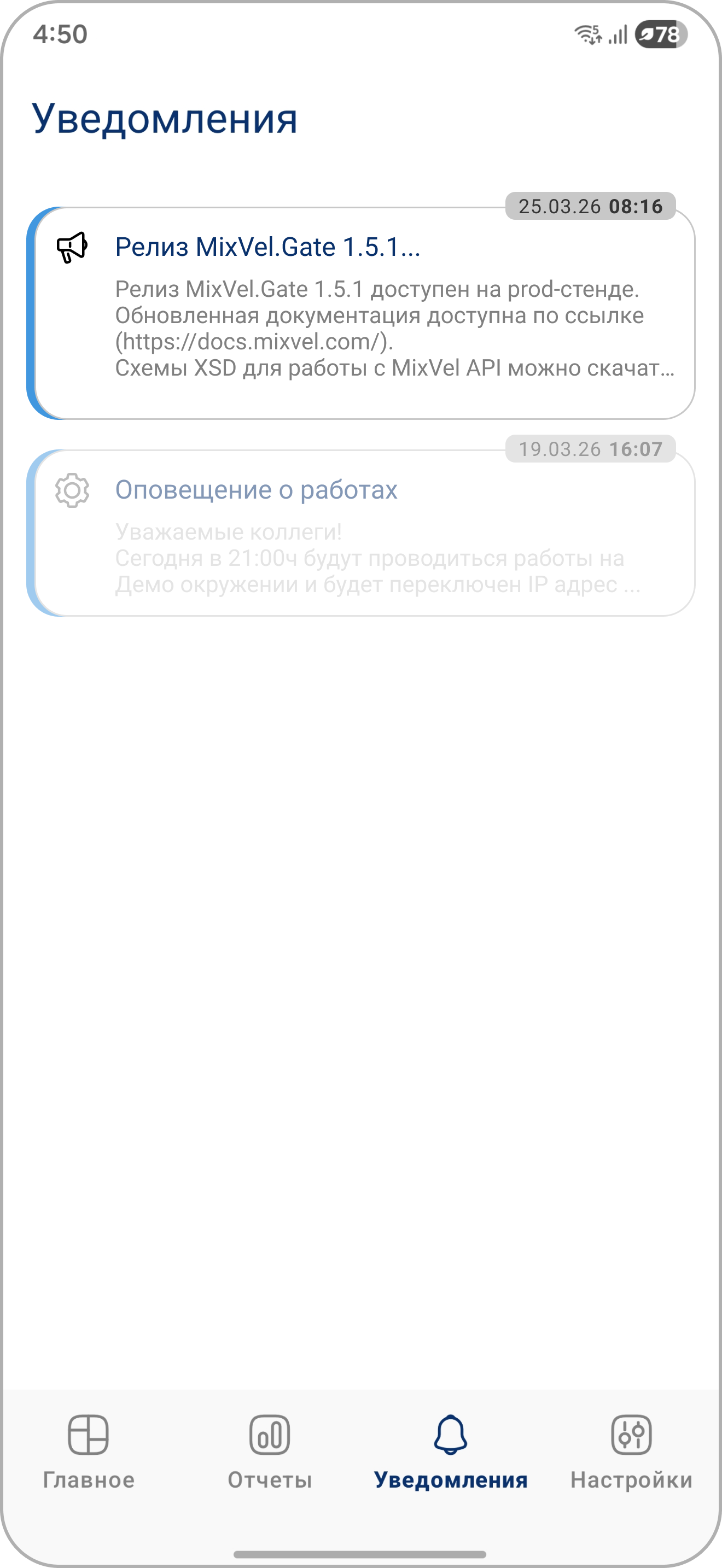 Экран Уведомления содержит список всех уведомлений. Прочитанные уведомления будут несколько темнее непрочитанных для визуального разделения одних от других.
